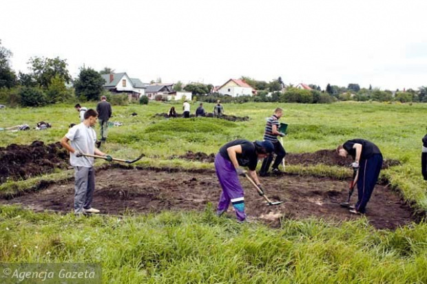 Pierwsza łopata, a ściślej: sześć łopat, została wbita rankiem na łące położonej kilkadziesiąt metrów na południe od grodziska. Miejsce niczym szczególnym się nie wyróżnia. To, co interesuje archeologów, czyli pochodząca z X-XI wieku osada produkcyjna, kryje się kilkadziesiąt centymetrów głębiej. Dlatego pierwszy dzień prac upłynął ekipie na zdejmowaniu warstwy trawy i humusu.