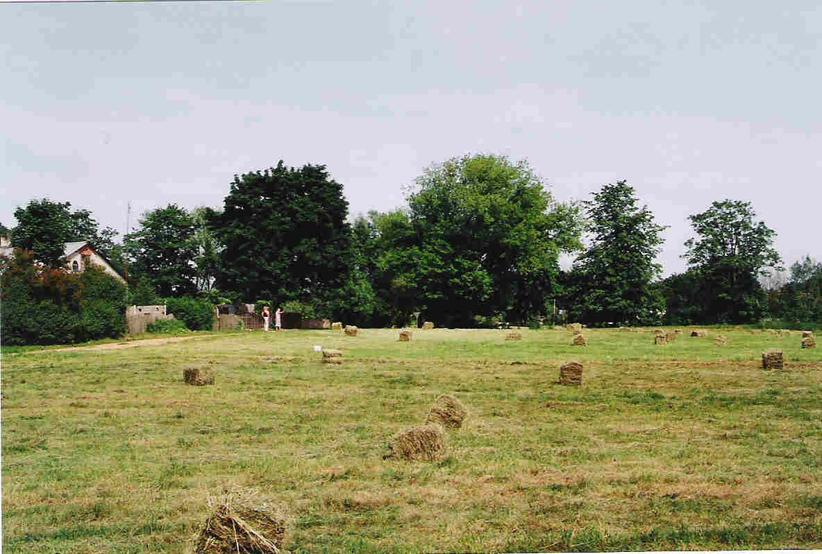 Całkowicie zniwelowane grodzisko przez którego środek obecnie przebiega polna droga. Na części stoją zabudowania, na zdjęciu część gdzie były przeprowadzane badania archeologiczne, widać ślady po wykopach badawczych w terenie.