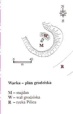 Stara Warka była grodem wczesnopiastowskim. Grodzisko usytuowane jest na krawędzi wysokiego brzegu Pilicy. Zachował się fragment wału na planie wycinka koła o długości około 30 m, 2 m wysokości i 8 m szerokości.Stara Warka oddalona jest od obecnego miasto o około 4 km.