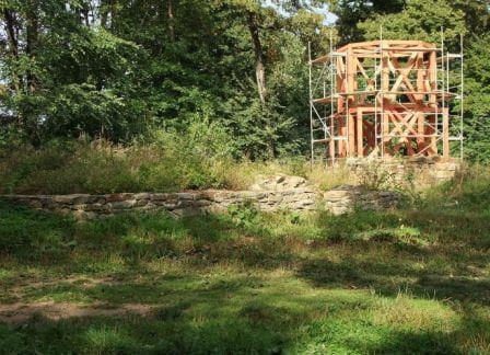 Ruiny rotundy-zamku, w tle tajemnicza XXI-wieczna budowla.