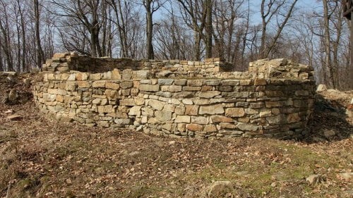 Miejsce, które mogłoby się stać mekką turystów jest zarośnięte, zachwaszczone, na szczycie wzgórza mamy nadto stare ławy i wiatę, obok ruin wyrasta zaś jakaś tajemnicza budowla (fot. wrzesień 2011)