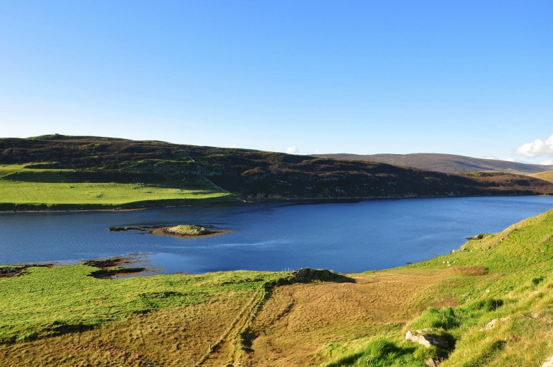 Relikty brocha z epoki żelaza na małej wyspie Burra Holm w zatoce (voe, nie wiem jak nazwać po polsku taką formacje geologiczną). Kopiec ma wysokość 2 m, średnica niecałe 16 m.