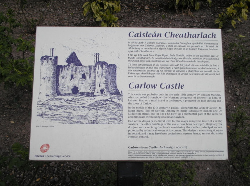 Zamek w Carlow został wybudowany prawdopodobnie około 1180 r. w. przez Hugh'a de Lacy. Budowla wzniesiona została na małej kamiennej wysepce na rzecze Barrow i otaczających ją moczarach, z zamiarem ochrony przeprawy rzecznej jak i samego miasteczka. Prawdopodobnie od lokacji zamku pochodzi nazwa miasta Carlow – Ceatharlough – głaz na jeziorze. W miejscu tym pierwotnie wznosiła się w XII w. drewniana wieża (motte) będąca typową rezydencją rycerska w tych czasach.