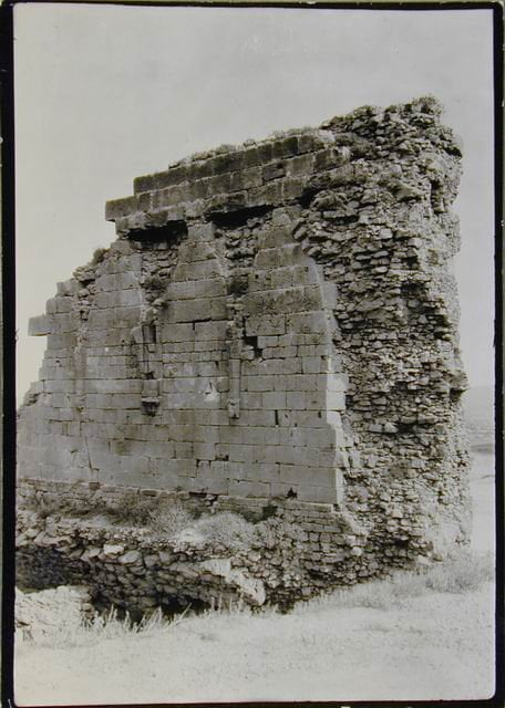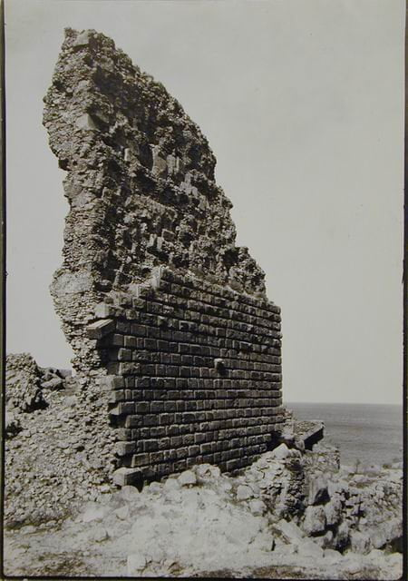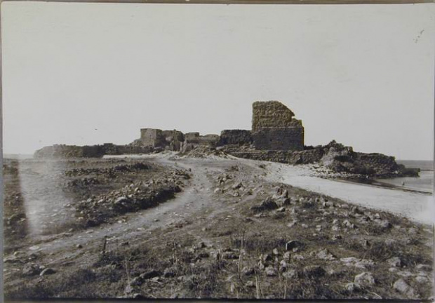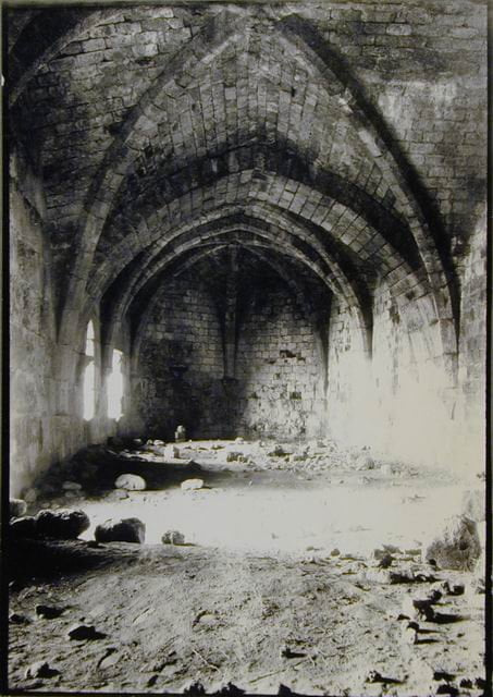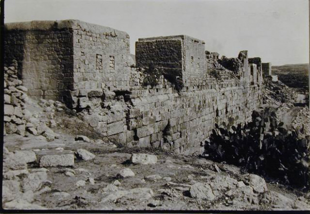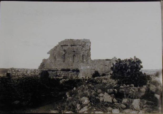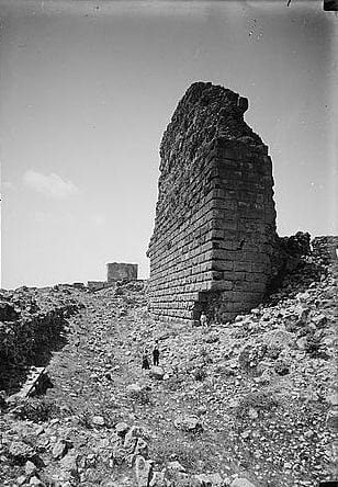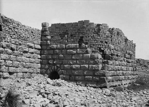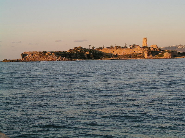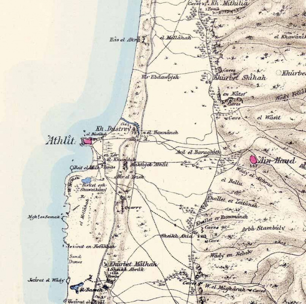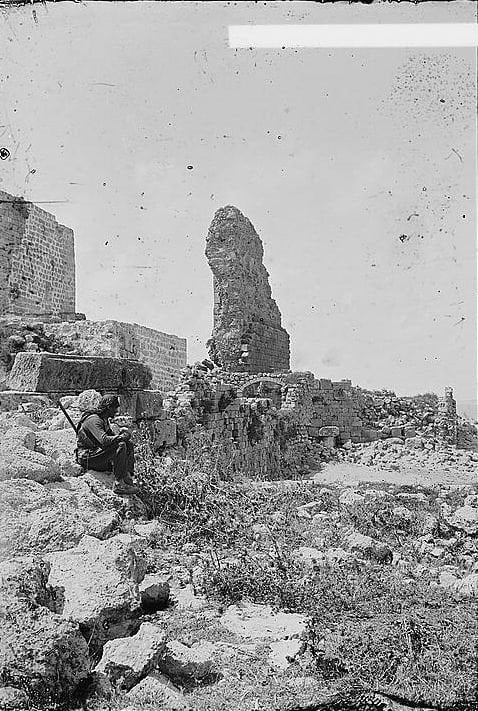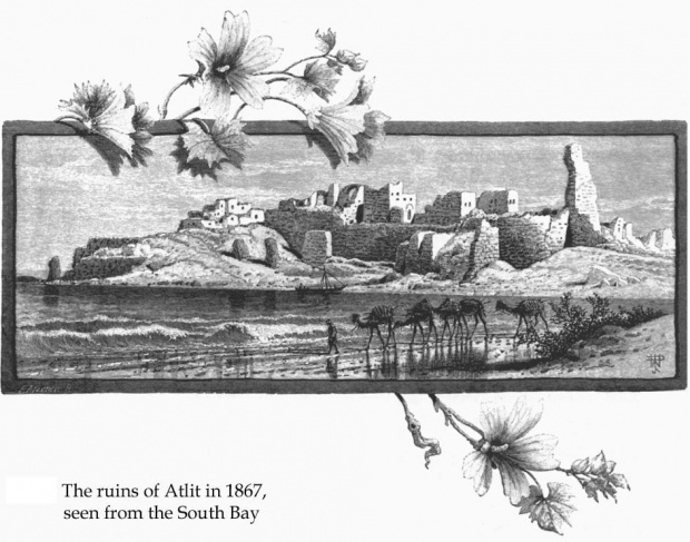 W XII wieku na tutejszym półwyspie wzniesiono największy i najsłynniejszy zamek Zakonu Templariuszy. Nazywano go Zamkiem Templariuszy lub Zamkiem Pielgrzyma (łac. Castrum Pelegrinorum). Wykorzystując walory terenu wybudowano wieżę, otoczoną dwoma liniami murów obronnych z fosą. Mury miały 7,5 metra wysokości, a fosa była na 2 metry głęboka. Do miasta prowadziły cztery bramy wjazdowe. Na okolicznych wzgórzach wybudowano dodatkową linię fortów, z których najważniejszym był H. Qarta. Twierdza nie była nowoczesna i nie odpowiadała zagrożeniom, jakie stały przed Królestwem Jerozolimskim.