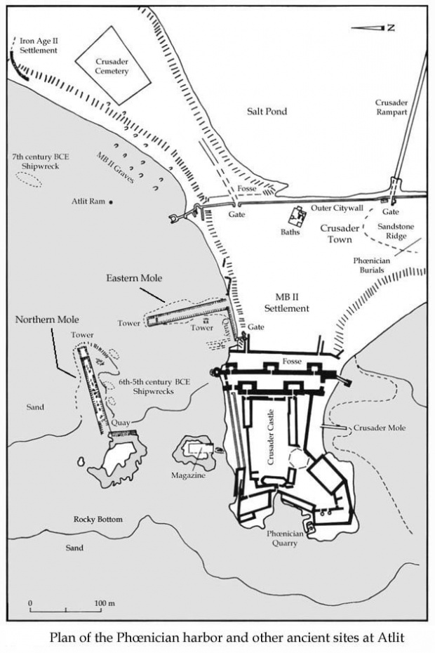 dąc za potrzebą chwili, w 1218 wybudowano na półwyspie nowy zamek Atlit. Przy jego budowie pomógł finansowo rycerz Walter z Avesnies, uczestnik V wyprawy krzyżowej do Ziemi Świętej. W pracach budowlanych pomagało wielu pątników i członków Zakonu Krzyżackiego. Mury zamku miały 6 metrów szerokości i 15 metrów wysokości. Przed murami znajdowała się wykuta w skale głęboka fosa. Do wnętrza zamku prowadziły dwie bramy. Atutem twierdzy był naturalny port, który zapewniał utrzymanie szlaku morskiego łączącego Ziemię Świętą z Europą.