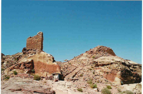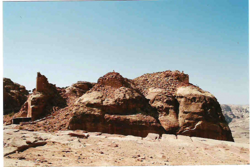 Ruiny zamku krzyżowców w Petrze, na tzw. "wyżynie ofiarnej" Nabatejczyków, obok wzgórza z dwoma kamiennymi obeliskami
