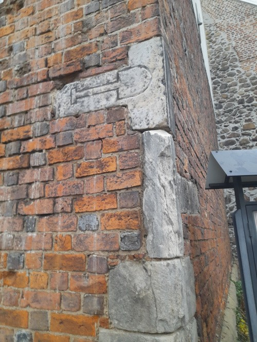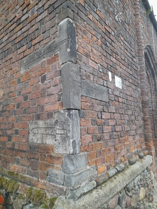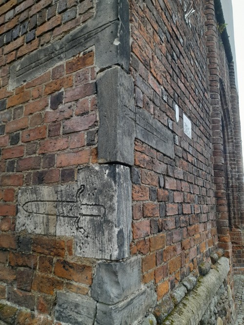 Wmurowane w elewacje gotyckiego kościoła św. Hieronima z rytami nóź, miecz, włócznia i łopata