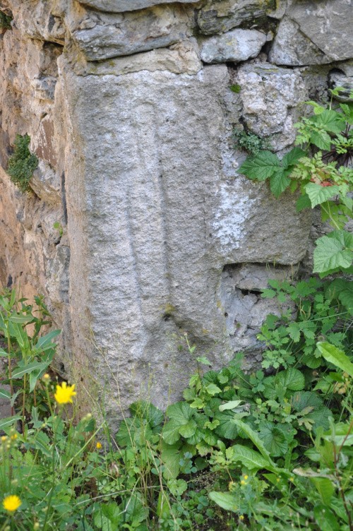 w murze otaczającym kościół, na prawo od bramy, bez lewego ramienia, widoczny ryt korda