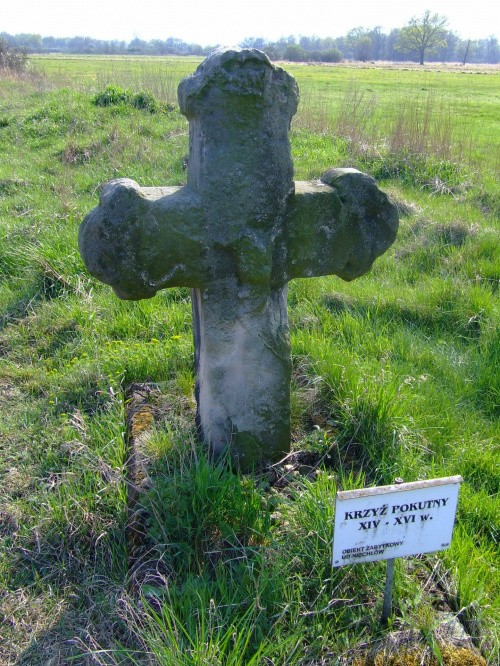 Krzyż na polu, z rytym tekstem na tylnej części krzyża w dużej części nieczytelnym. Od frontu pozostałości krucyfiksu.
