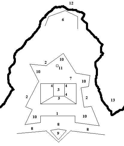 Plan twierdzy: 1. Brama; 2. Wały ziemne; 3. Główny dziedziniec; 4. Kwatery załogi; 5. Magazyny; 6. Platforma obserwacyjna; 7. Dziedziniec; 8. Fosa; 9. Rawelin; 10. Bastiony; 11. Cysterna; 12. Wejście do zatoki; 13. Zatoka