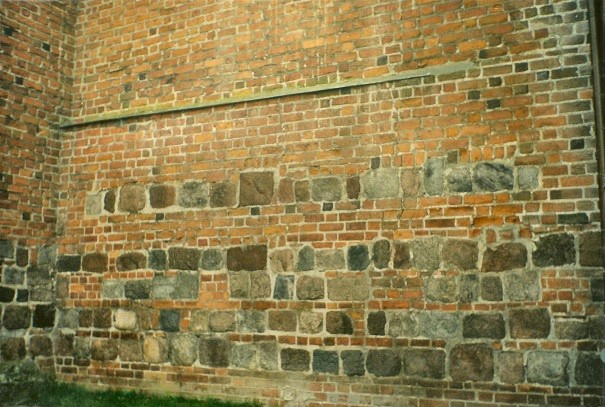 Granitowe ciosy - ponoć z wcześniejszego kościoła romańskiego - użyte w ceglanych murach gotyckiego kościoła