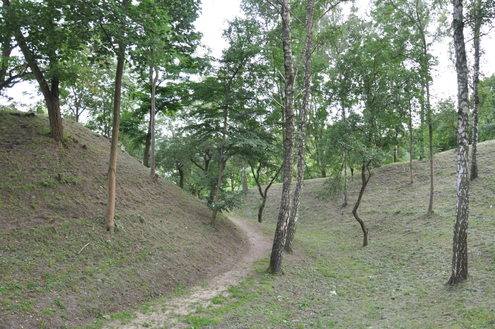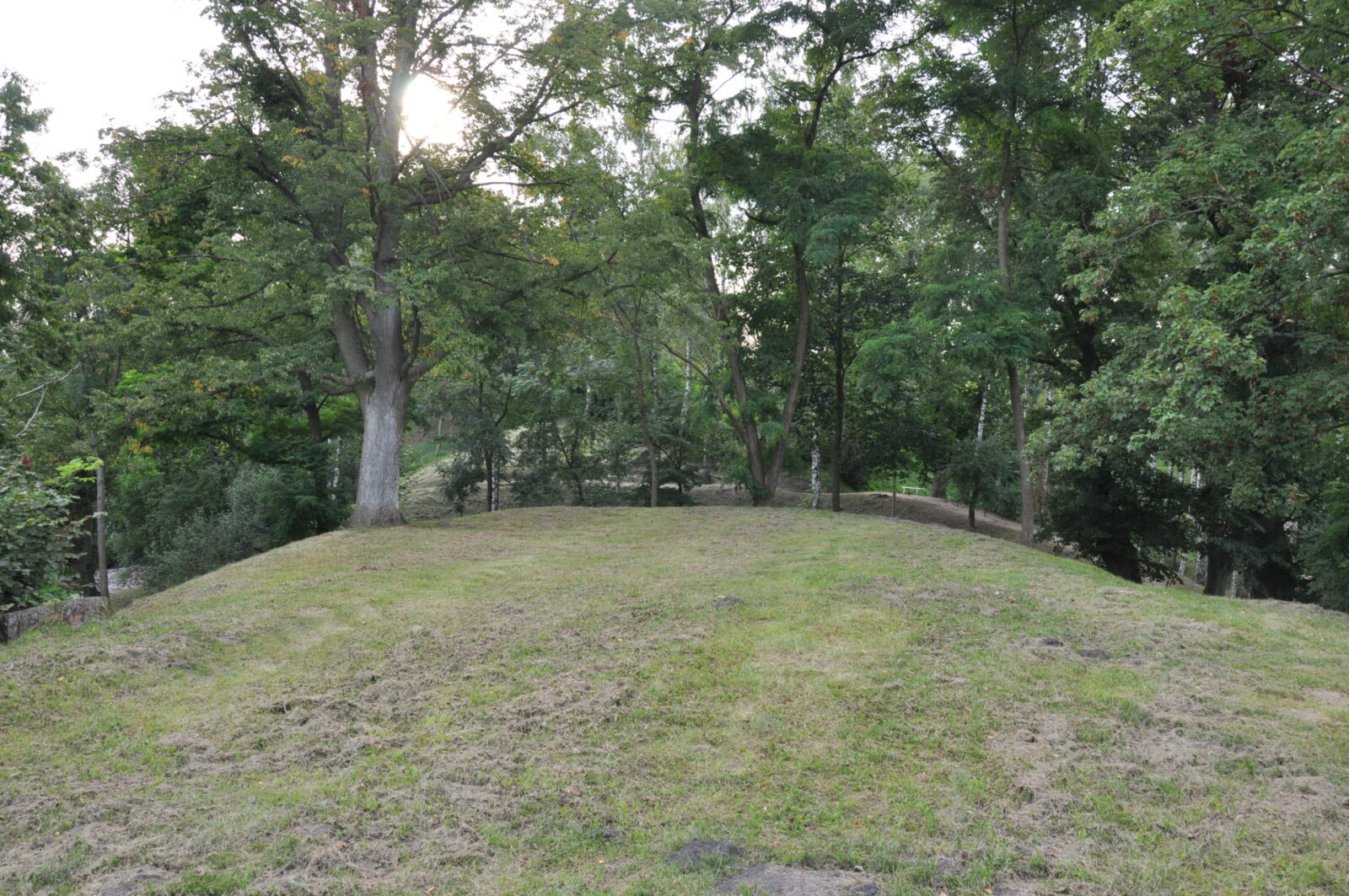 Stanowisko archeologiczne zwane "Kopcem"(Dziewiczy Kopiec/Góra). Znajdował się tu gród użytkowany od połowy XIII wieku do początku XIV w. Mógł on być odbudowany jeszcze po 1325 roku. Odbudowa w tym okresie wiązała się z działalnością zakonu Miechowitów. Być może stanowisko to jest związane z pierwszym drewnianym dworem biskupim. Użytkowane także w okresie nowożytnym – droga z otoczaków, wraz z kapliczką.