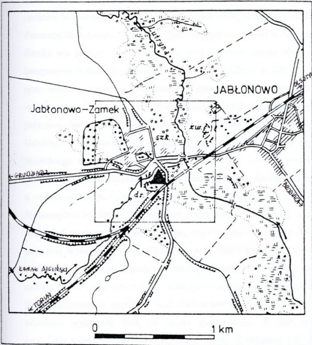 Około 0,4 km na zachód od grodziska w Jaguszewicach i około 0,1 km na wschód od obecnego wzgórza pałacowego znajduje sie kolejny obiekt który w literaturze czasem okreslany jest jako zamek. Wykopaliska archeologiczne dowiodły istnienia grodu obronnego wciśniętego w widły Kanału Sicińskiego i rozlewiska rzeki Lutryny. Gród w Jabłonowie – Zamku jest z pewnością późniejszy niz sąsiedni w Jaguszewicach. Zauważalna jest różnica w położeniu obu grodów. Obiekt w Jabłonowie Zamku ma jeszcze lepsze położenie strategiczno-militarne przy mniej korzystnym położeniu gospodarczym. Przeprowadzone w 1989 roku na tym terenie prace archeologiczne lokalizują obiekt na niższym wyniesieniu od wzgórza, na którym obecnie znajduje się pałac. Wzgórze pałacowe jest obecnie oddzielone od grodziska drogą Brodnica-Grudziądz. Ponadto między drogą a grodziskiem płyną wody Kanału Sicińskiego. Grodzisko to od północy i północnego - wschodu zabezpieczało szerokie rozlewisko rzeki Lutryny, a od zachodu wspomniany ciek wodny nazywany Kanałem Sicińskim. Jednocześnie od strony południowej widoczne jest do dzisiaj znaczne około 3-5 metrowe obniżenie terenu, prawdopodobnie pozostałość po sztucznie wykopanej fosie. Zważywszy, że nasyp kolejowy od strony wschodniej istnieje dopiero od drugiej połowy XIX wieku, sądzić można, że ta część grodu także zabezpieczona była wodami Lutryny. Niewykluczone, że część jej wód skierowano do Kanału Sicińskiego sztucznie wykopaną fosą od strony południowej. W ten sposób grodzisko zabezpieczono ze wszystkich stron. Dodatkowo cały gród otoczony był wałem drewniano- ziemnym. Miał on kształt owalny, zwężając się ku północy i wciskając się między Kanał Siciński a Lutrynę. Obecnie wał obronny widoczny jest tylko od strony zwężenia północnego, gdzie w nieckowatym obniżeniu znajdował się majdan. Pozostałą część grodziska zajmuje obecnie XIX wieczny cmentarz. Być może po zniszczeniu osady w Jaguszewicach większą wagę przywiązano do dogodnego położenia obronnego. Poza tym forma wcześniejszego grodu w kształcie stożka uniemożliwiała jego rozwój przestrzenny. W przywileju wydanym w Łowiczu z 1222 roku Konrad Mazowiecki przekazał 11 grodów i 100 wsi w ziemi chełmińskiej biskupowi Chrystianowi. Dzięki temu przekazowi możemy stwierdzić, że widoczne na majdanie spalenie grodu w Jabłonowie musiało nastąpić przed 1222 rokiem. Sukcesy Prusów oraz niepowodzenia akcji misyjnej biskupa Chrystiana przyczyniły się do pojawienia się na tym terenie zakonu Krzyżackiego.