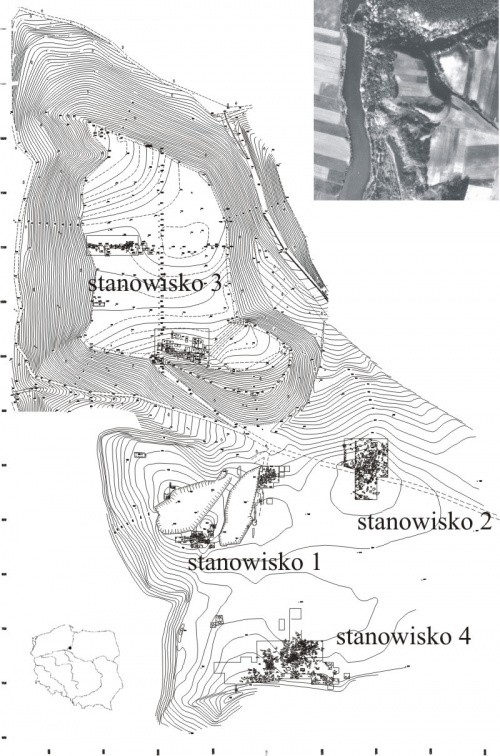 Poniżej zespół osadniczy w Kałdusie, st.1-cmentarzysko, st.2-osada, st.3-grodzisko, st.4-cmentarzysko