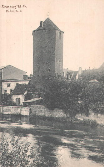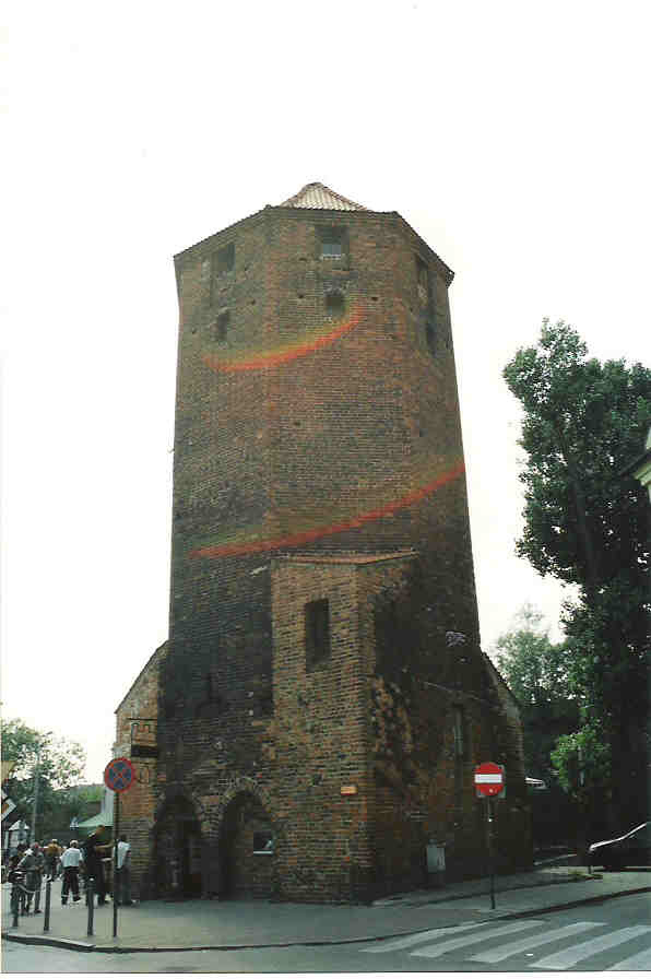Wieża Bramy Mazurskiej zbudowana wraz z murami miejskimi w latach 1320-1330, nadbudowana ok. 1370, odnowiona w II połowie XIX wieku