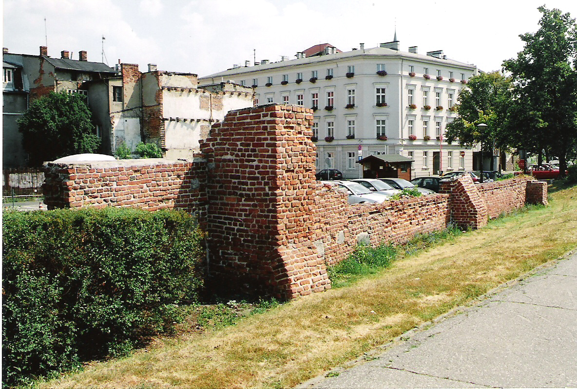 Mury miejskie, kamienno-ceglane, zbudowane zostały w ciągu XV wieku w miejsce dawnych wałów ziemnych. Ostatecznie ukończonE dopiero w pierwszej połowie XVI wieku miał typowo średniowieczną konstrukcję, stosowaną na ziemiach polskich w XIII-XV wieku i od samego początku był już przestarzały. Zapewne władze miasta zdawały sobie sprawę ze słabości własnych fortyfikacji, bowiem wkrótce wzmocniono je murowanymi basztami i bramami. Bramy nie posiadały jednak jak gdzie indziej, mostu zwodzonego i przedbramia, przez co ich możliwości obronne były ograniczone.Otaczały one miasto od południa wzdłuż ulicy Pod Blankami i miały dwie bramy u wylotów ulicy Długiej: na wschodzie - Kujawską, na zachodzie - Poznańską; trzecia brama - Gdańska - znajdowała się po drugiej stronie Brdy na początku drogi Gdańskiej i zamykała dojście do miasta od północy. Do zamku prowadziła nadto bramka na końcu dawnej ulicy Żabiej (dziś: Teofila Magdzińskiego). Z murów wyrastało kilka baszt ze strzelnicami. Do dziś zachowała się tylko jedna baszta pomiędzy ulicą Pod Blankami a Nowym Rynkiem. Mury miejskie zostały w znacznym stopniu zniszczone w czasie wojen szwedzkich w XVII w. Później część ich posłużyła do dalszej zabudowy miasta. Ostatecznie murowane fortyfikacje Bydgoszczy zostały w znacznej części rozebrane w pierwszej połowie XIX wieku, podczas budowy loży masońskiej i synagogi. Do naszych czasów zaledwie mały fragment murów między Wałami Jagiellońskimi a ulicą Pod Blankami (źr:www.odyssei.com, http://www.wenecja.art.pl)