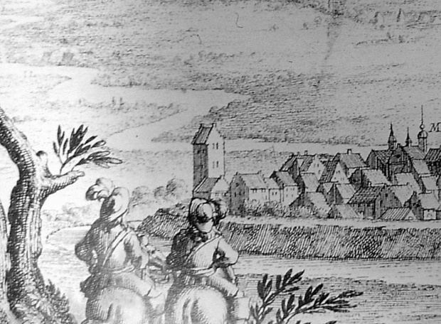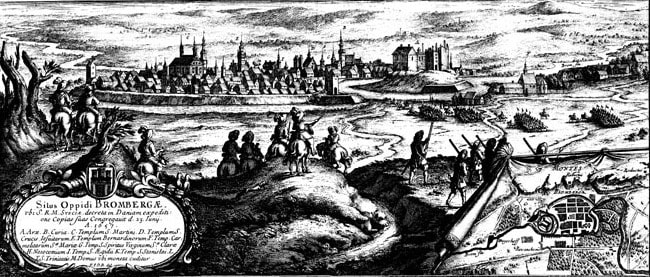 Brama Poznańska (na pierwszym planie) na sztychu Bydgoszczy Erika Dahlberga z 1657 r. Z boku oznaczona literą M wieża jednego z budynków mennicy bydgoskiej