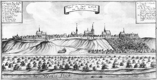 - widok Chełmna od północy (rycina z albumu: "Toruń i miasta Ziemi Chełmińskiej na rysunkach Jerzego Fryderyka Steinera z pierwszej połowy XVIII wieku" (tzw. Album Steinera), wyd. UMK, Toruń 1998;