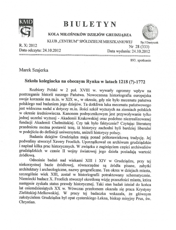 Na stronie internetowej Koła Miłośników Dziejów Grudziądza ukazał się mój polemiczny artykuł o przywileju z 1524 r. dla Kościoła grudziądzkiego.