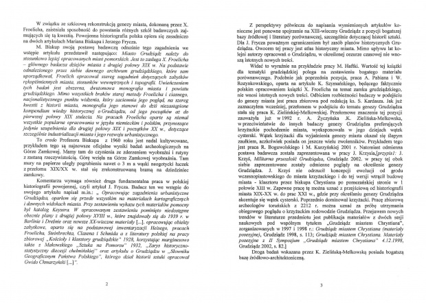 Z perspektywy półwiecza do napisania wymienionych artykułów konieczne jest ponowne spojrzenie na XIII-wieczny Grudziądz z pozycji bogatszej bazy źródłowej i literatury porównawczej, szczególnie dotyczącej historii sztuki. Dla J. Frycza poważnym ograniczeniem był zasób planów historycznych Grudziądza. Owocem tej pracy jest atlas historyczny miasta. Mimo upływu lat kolejni autorzy opracowań o Grudziądzu, w określonej cezurze czasowej nie wnoszą istotnych nowych treści. Widać to wyraźnie na przykładzie pracy M. Haftki. Wartość tej książki dla tematyki grudziądzkiej polega na zestawieniu bogatego materiału porównawczego. Podobnie jak poprzednia pozycja, praca A. Pabiana i W. Rozynkowskiego, oparta na artykule K. Szymańskiego, będącego faktycznie polskim opracowaniem książki X. Froelicha na temat zamku grudziądzkiego, nie wnosi istotnych nowych treści. Odbiciem rozbieżności badaczy w podejściu do genezy miasta jest praca zbiorowa pod redakcją ks. S. Kardasza. Jak już zaznaczyłem wcześniej, przełomem w podejściu do tematu genezy Grudziądza stała się praca K. Zielińskiej-Melkowskiej. Przełomowe znaczenie tej pozycji zauważyła już w 1992 r. A. Życzyńska .K. Zielińska-Melkowska, w przeciwieństwie do innych badaczy genezy Grudziądza preferujących krzyżackie pochodzenie miasta, wyeksponowała w jego dziejach wątek cysterski. Wątek krzyżacki dla wyjaśnienia genezy miasta okazał się ślepym zaułkiem, aczkolwiek posiada on jeszcze wielu zwolenników. Przykładem tego jest praca R. Boguwolskiego i M. Kurzyńskiej 2001 r.. Natomiast odmienna postawa badawcza została zaprezentowana w pracy J. Krzysia,[przypis1: J. Krzyś, Militarna przeszłość Grudziądza, Grudziądz 2002. w pracy tej obok siebie zaprezentowane zostały odmienne poglądy na określenie genezy Grudziądza. J. Krzyś nie odrzucił koncepcji ewolucji od grodu wczesnopiastowskiego do miasta krzyżackiego i do tej wersji wtrącił budowę miasta - klasztoru przez biskupa Chrystiana po pomezańskiej stronie w 1 połowie XIII w. Zapewne pracę tę można uznać z przejściową od historiografii miasta XIX-XX w. do prac XXI w., gdzie przy określaniu genezy Grudziądza akcentuje się wątek cysterski. Poprzednio dominował krzyżacki. Pracę zbiorową archeologów toruńskich z 2012 r. można uznać za próbę utrzymania obiegowego poglądu o krzyżackim rodowodzie Grudziądza. Przejawem nowych trendów w literaturze przedmiotu jest publikacja materiałów z dwóch sesji naukowych pod wspólnym tytułem „Grudziądz miastem Chrystiana” , zorganizowanych w 1997 i 1998 r.: Grudziądz miastem Chrystiana (materiały posesyjne), Grudziądz 1998, s. 113; Grudziądz miastem Chrystiana. Materiały posesyjne z II Sympozjum „Grudziądz miastem Chrystiana” 4.12.1998, Grudziądz 2002, s. 82.]