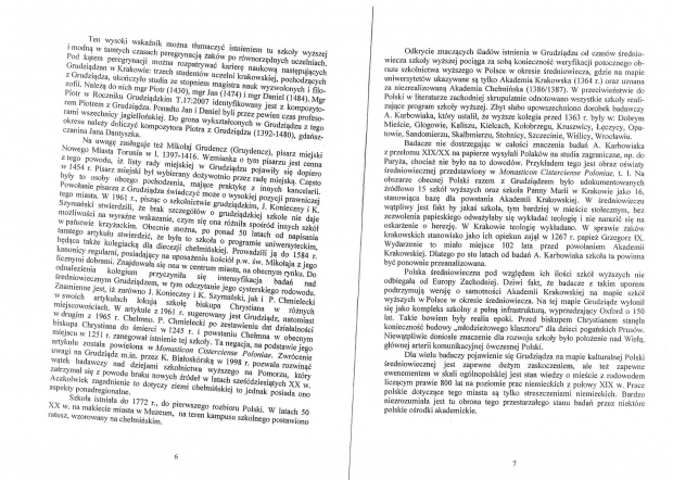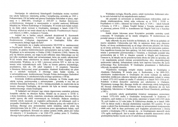 Nawiązując do całościowej historiografii Grudziądza można wyróżnić trzy szkoły badawcze: niemiecką, polską i kompilacyjną, powstałą po 1945 r.. Podsumowania 150 lat badań nad genezą Grudziądza dokonałem w pracy, napisanej w l. 2000-2001, Grudziądz w XIII-XIV w. Studium historyczno-architektoniczne, dostępnej w maszynopisie w czytelni naukowej Biblioteki Miejskiej im. Wiktora Kulerskiego w Grudziądzu. W świetle tych badań wyłoniły się ślady szkoły wyższej w Grudziądzu, istniejącej w latach 1218-1772. Pierwszy artykuł na ten temat ukazał się w Biuletynie Przedmiotowym Nauczycieli Historii, w 2000 r., wydanym w Toruniu. Artykuł ten w bardzo ostrych zdaniach skrytykował K. Kaczmarek w Roczniku Grudziądzkim, T.15:2003. „Artykuł ukazał się pod tytułem Średniowieczne Collegium Augustianum w Grudziądzu. Kilka słów o uniwersytecie, którego nigdy nie było”.