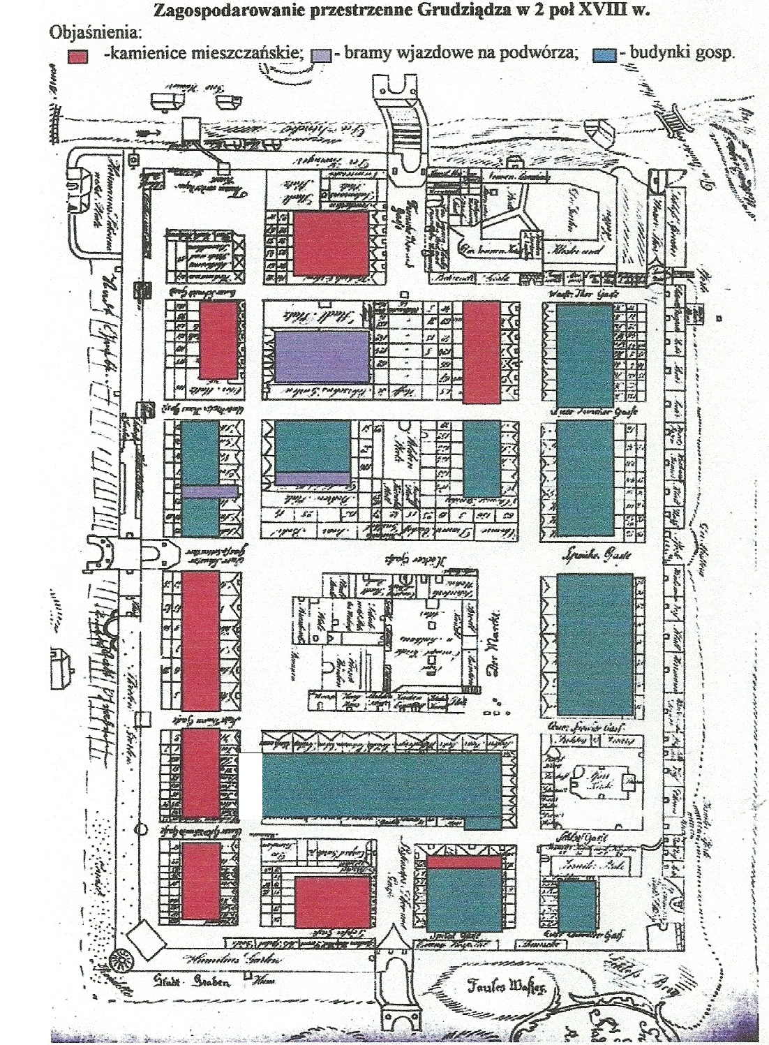 Każde miasto lokowane przez Krzyżaków posiadało centralny rynek z ratuszem. W Grudziądzu od tej zasady odstąpiono. W średniowieczu nie posiadał ratusza w środku miasta. Sądy odbywały się przy kościele na Rybakach, ok. 300 m na południe od murów miejskich. Ciekawostką jest fakt, że najstarsze domy przy obecnym Rynku, od strony architektonicznej są od niego odwrócone plecami. Ich fronty są od strony podwórza. Oznacza to, że ten kwartał nie był pierwotnie rynkiem. Inną zagadkowa kwestią jest linia spichrzy. Ich ilość wskazywałaby na istnienie miasta o powierzchni porównywalnej z Toruniem, a Grudziądz posiadał taką powierzchnię jak w XIX w. klasztor cysterski w Mogile pod Krakowem. Oznacza to, że służyły one do przechowywania zboża nie tylko na sprzedaż, ale i do zaspokojenia potrzeb (dzisiaj powiedzielibyśmy sfery nieprodukcyjnej) społeczności szkolnej. Infrastruktura szkoły była zapewne korzystna dla życia politycznego Prus Królewskich. W Grudziądzu przemiennie z Malborkiem odbywały się sejmiki ziemskie.