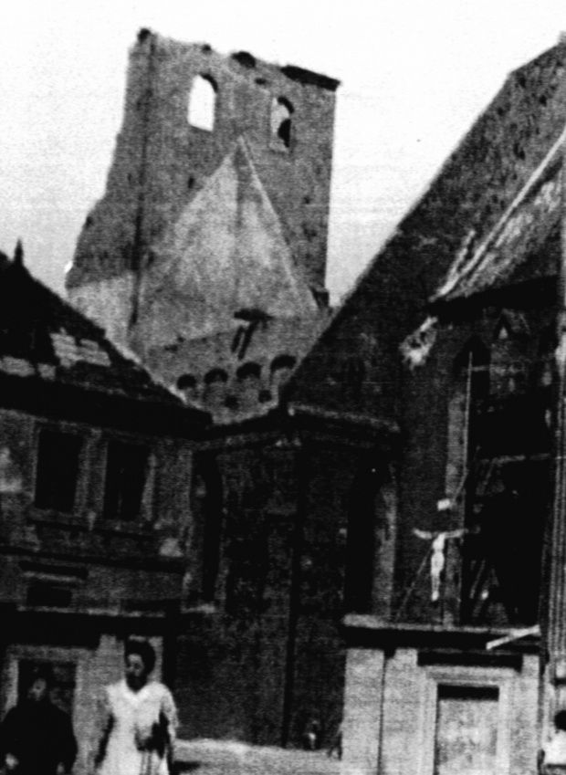 Ryc. 1. Kościół św. Mikołaja w 1945 r. Widoczna niedokończona bazylika. Kadr z fot. H. Gąsiorowskiego.