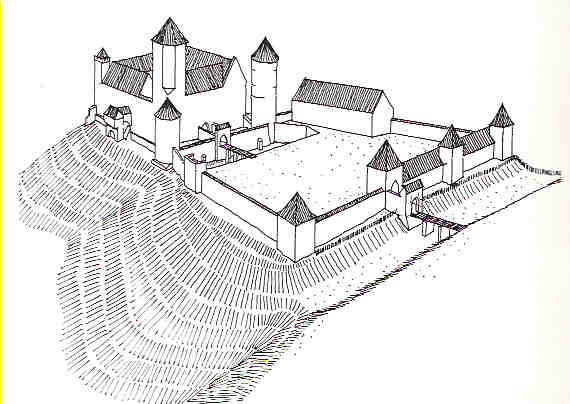 rekonstrukcja zamku w XIV wieku wg.I.Sławińskiego z uzupełnieniami J.Salma 1996(źr:Leksykon zamków w Polsce,str.186)