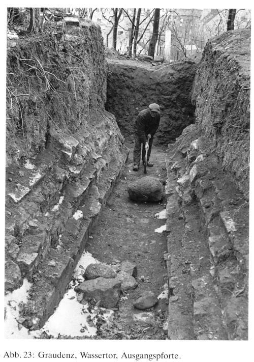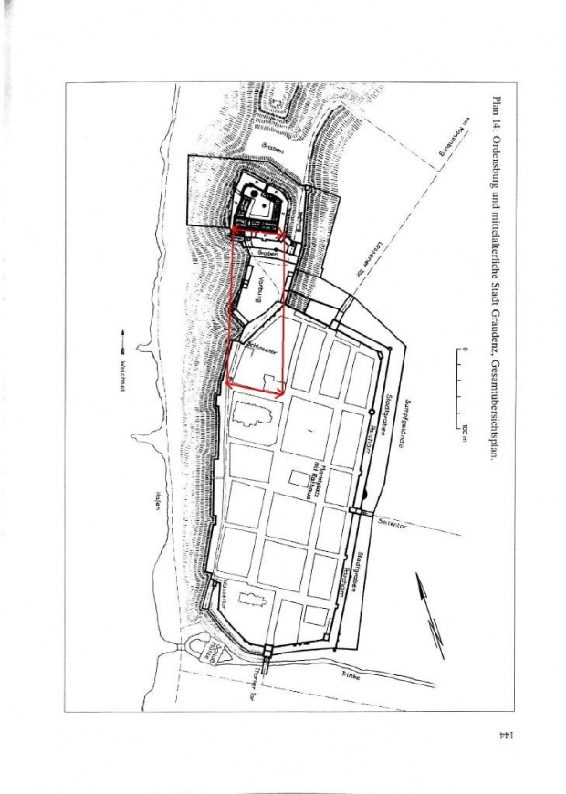 96-97 Dokument z 1380 r. wielkiego mistrza von Kniprode, zezwalający na budowę piwnic przez rajców na terenie Grudziądza. Ten dokument posiada istotne znaczenie w badaniach archeologicznych. Wyznacza bowiem granicę czasową przy określaniu wieku kamienic z piwnicami a także wyjaśnia dlaczego na terenie Grudziądza w obrębie murów takie kamienice trudno znaleźć. Archeologicznie dowiedziono, że poziom średniowiecza zalega nawet na głębokości 3 m. Stąd też obecne piwnice były w średniowieczu na poziomie parteru. Treść tego dokumentu można rozpatrywać pod kątem militarnym. Jeśli, jak wskazują źródła, miasto było traktowane jako zamek, wszelkie piwnice zagrażały jego obronności z punktu widzenia interesów Zakonu.