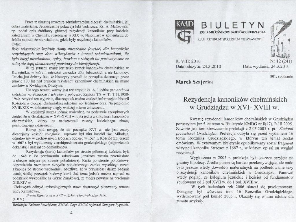 Kwestię rezydencji kanoników chełmińskich w Grudziądzu poruszyłem już 5 lat temu w Biuletynie KMDG nr 8(47), R.III 2005. Zawarte jest tam streszczenie prelekcji z 2.03.2005 r. pt.: Śladami przeszłości Grudziądza. Prelekcja odbyła się przed wydaniem 16 tomu Rocznika Grudziądzkiego, w którym ten temat został omówiony. W cytowanym biuletynie opublikowany został fragment wizytacji kanonika Strzesza z 1667 r., w którym opisał on wygląd rezydencji.