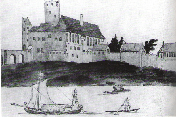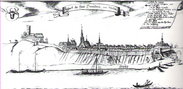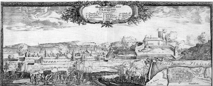 Oblężenie Grudziądza przez Szwedów 4 stycznia 1656 roku na rysunku Dahlberga, zamek po prawej stronie