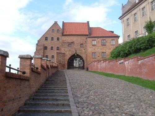 Nie będzie zapewne błędu historycznego, jeśli w tym temacie zamkowym umieszczę tez spichrze nadwiślańskie o charakterze obronnym, z kalenicowym układem dachów, typu klasztornego. Dla wieków XVI-XVIII mamy dowodnie w Grudziądzu siedzibę kanoników chełmińskich. Grudziądz w świetle źródeł pisanych był odpowiednikiem zamków kanoników pomezańskich w Kwidzynie i warmińskich w Olsztynie. Do spichrzy grudziądzkich zwożono dziesięciny z całej diecezji chełmińskiej. Jeszcze na planach katastralnych z końca XVII w. spichrze nie są własnością mieszczan i nie figurują w miejskich księgach katastralnych. W świetle przywileju króla Zygmunta Starego dla kościoła św. Mikołaja w Grudziądzu z 1524 r., zachodnia część miasta stanowiła odrębne miasteczko kościelne.