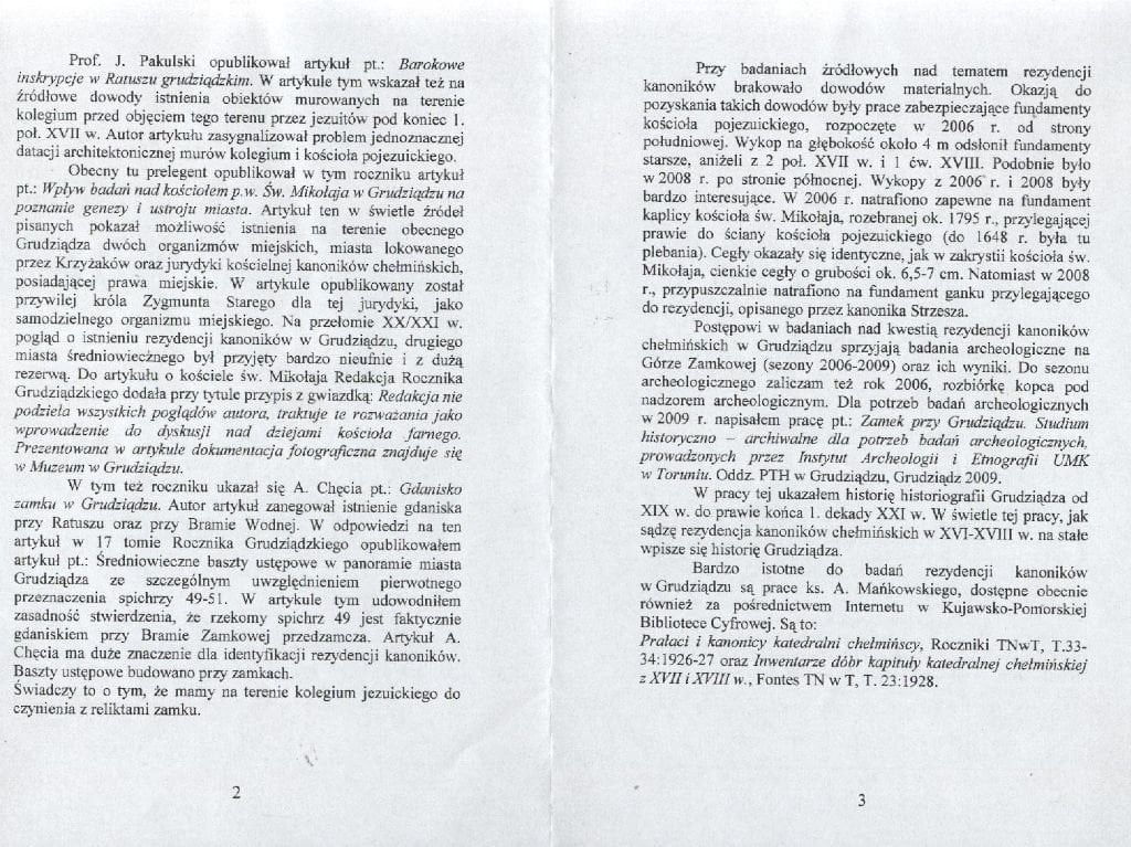 Wygłoszona w 2005 r. prelekcja była jeszcze przyjęta na granicy hipotezy. Źródła pisane są bardzo przekonywujące, ale mało było jeszcze wtedy dowodów materialnych na podbudowanie tezy o rezydencji kanoników chełmińskich w Grudziądzu. Panował wtedy pogląd, że kolegium jezuickie i kościół od fundamentów zbudowano od 2 poł XVII w. do 1 poł. XVIII w.