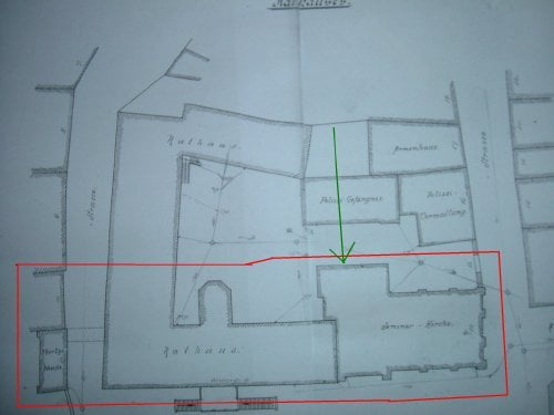 93-94 X. Froelich podał treść dokumentu z 1313 r. dotyczącego ratusza, łaźni oraz kramów z mięsem . Dokument ten nie podaje dokładnej lokalizacji domu kupieckiego.