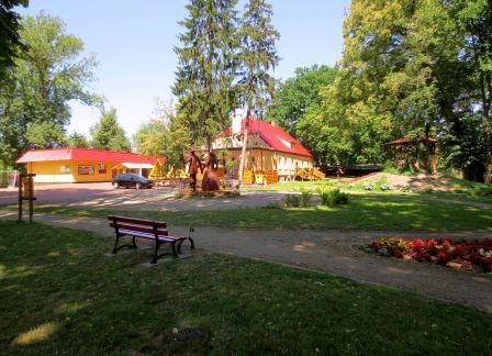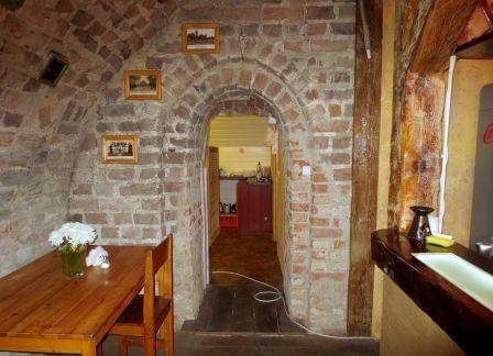Obok dworu, w ogrodzonych piwnicach funkcjonuje lokalna knajpa. Oprócz dwóch karków i panienki za barem są tam też stare mury pochodzące zapewne z zamku. Wstęp wolny (fot. lipiec 2015)