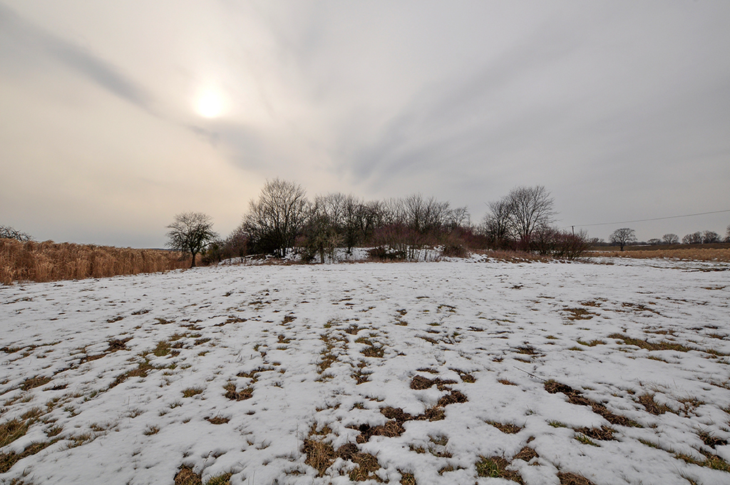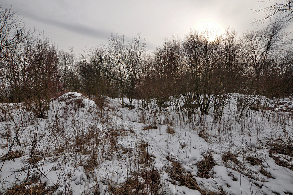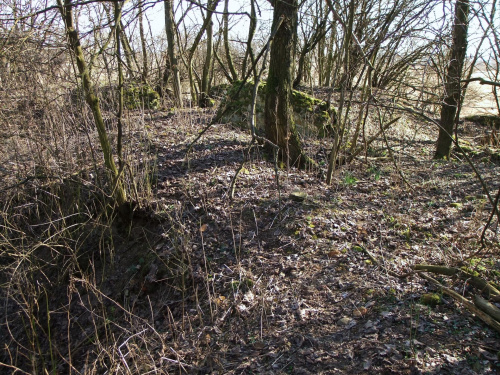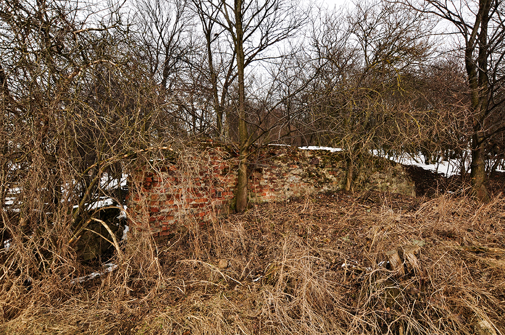 Szału nie ma. Trochę fundamentów w prywatnych chaszczach. Teren co prawda niedaleko posesji, ale nieogrodzony, więc nie ma problemów z wejściem. (Fot. marzec 2014)