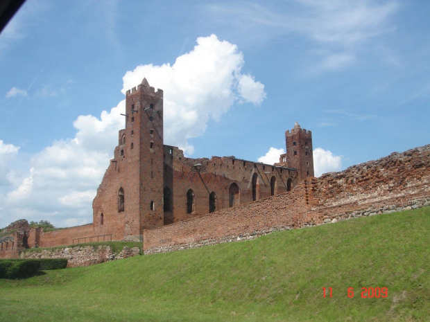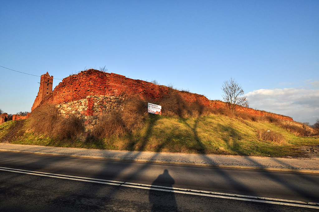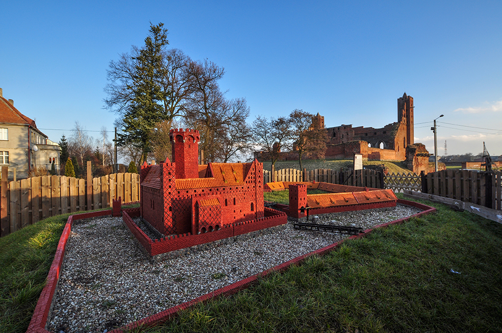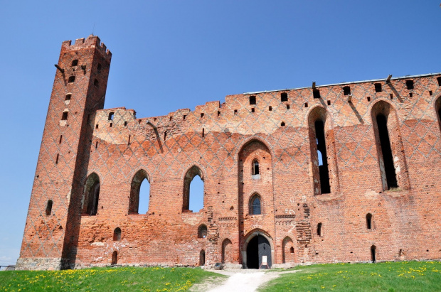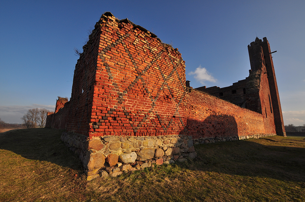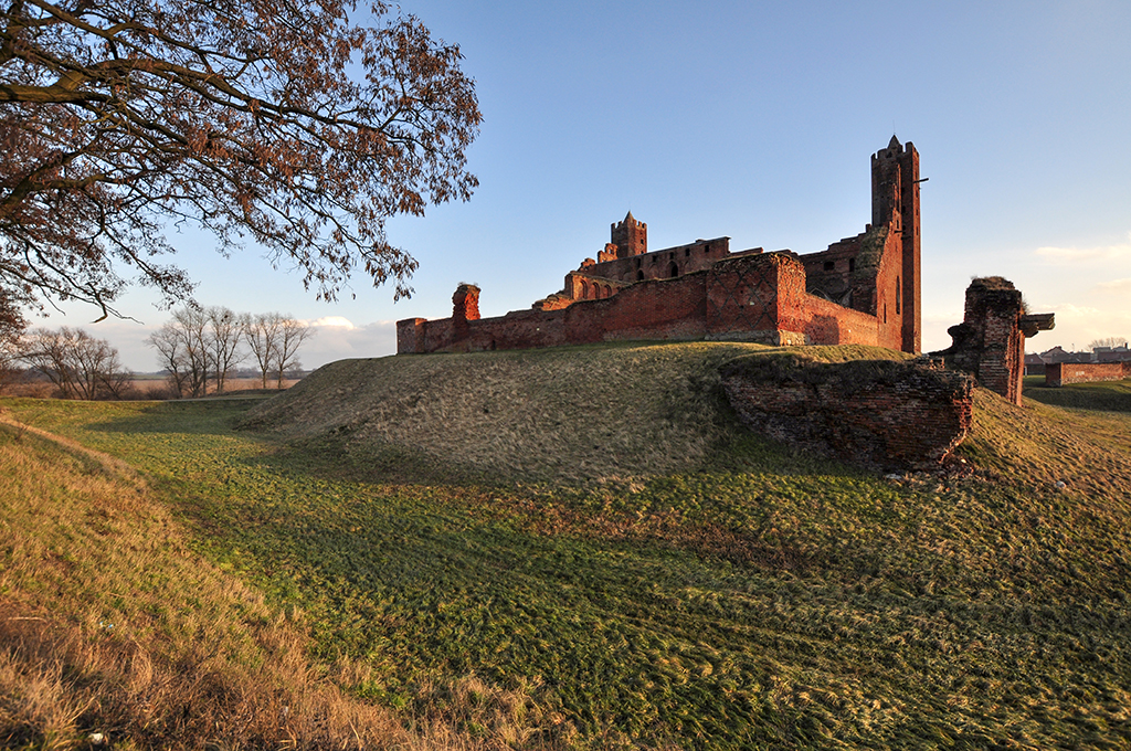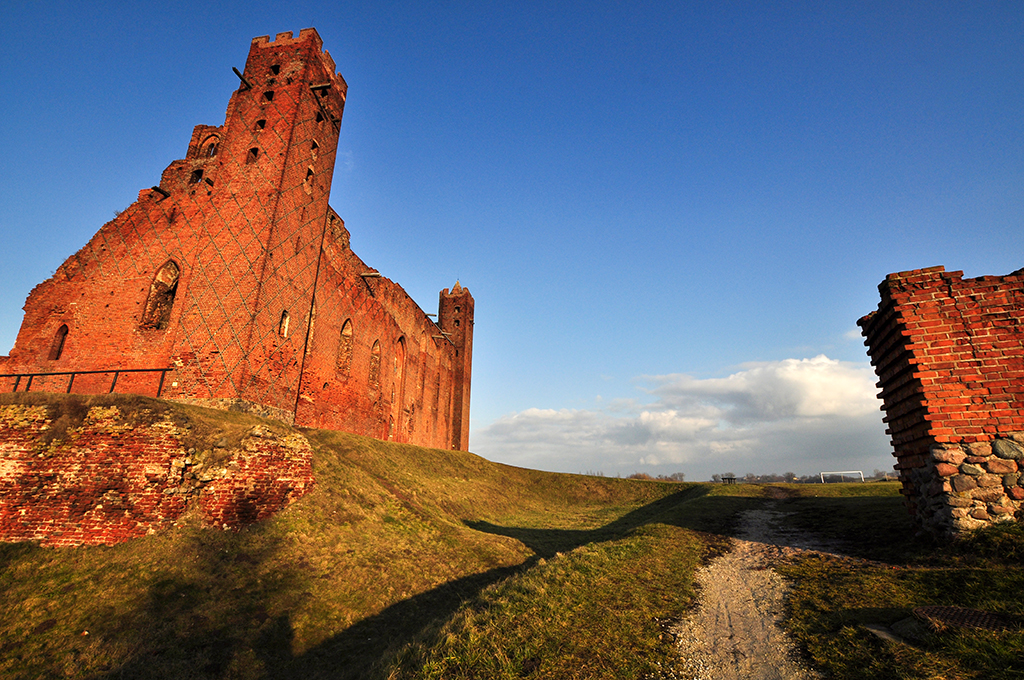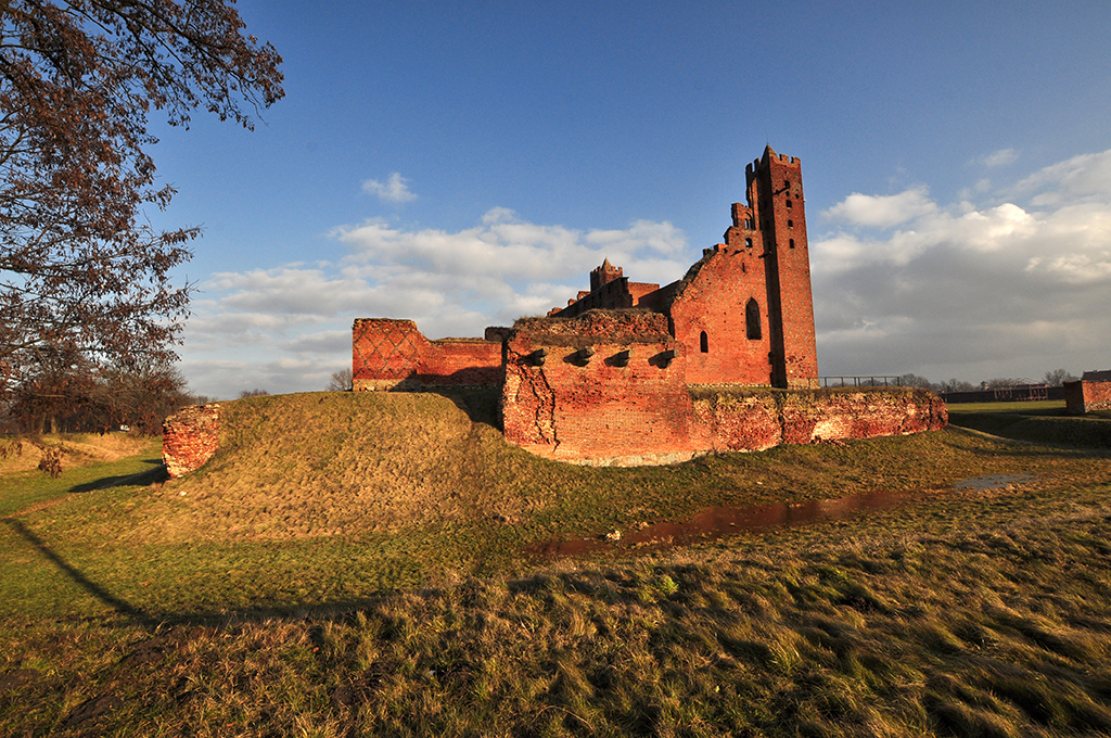 Zamek krzyżacki w Radzyniu Chełmińskim został zbudowany w okresie od końca XIII wieku do lat 30. XIV wieku. Od 1454 r. siedziba polskich starostów. W XVII wieku został poważnie zniszczony w trakcie oblężenia przez Szwedówm, następnie opuszczony. Od 1772 stopniowo rozbierany, z pozyskanego materiału budowlanego wzniesiono wiele domów w Radzyniu. W roku 1837 przerwano rozbiórkę, a w dwa lata później rozpoczęto pierwsze prace zabezpieczające. Ruiny były poddawane dalszym zabiegom konserwatorskim w ciągu XIX i XX w. (m.in. odgruzowanie terenu zamku, zabezpieczenie sklepień w piwnicach, zadaszenie kaplicy, następnie w latach 60-tych budowa żelbetowego przekrycia kaplicy). Zamek założony jest na planie kwadratu o boku 52 m, z dziedzińcem krużgankowym, wielką ośmioboczną wieżą w narożu północno-zachodnim oraz mniejszymi czworobocznymi wieżami we wszystkich narożach. Na południe od zamku znajdowało się przedzamcze. Do dzisiaj częściowo zachowało się skrzydło południowe z kaplicą (bez sklepienia), fasada w prawie pełnej wysokości, dwie narożne wieżyczki, przyległa do niego część skrzydła wschodniego i partie murów pozostałych skrzydeł. Z przedzamcza zachowały się prawie w całości dolne partie murów południowego i zachodniego. Ruiny zamku są udostępnione zwiedzającym. Jest możliwość wejścia na jedną z narożnych wież, z której roztacza się rozległy widok na okolicę.