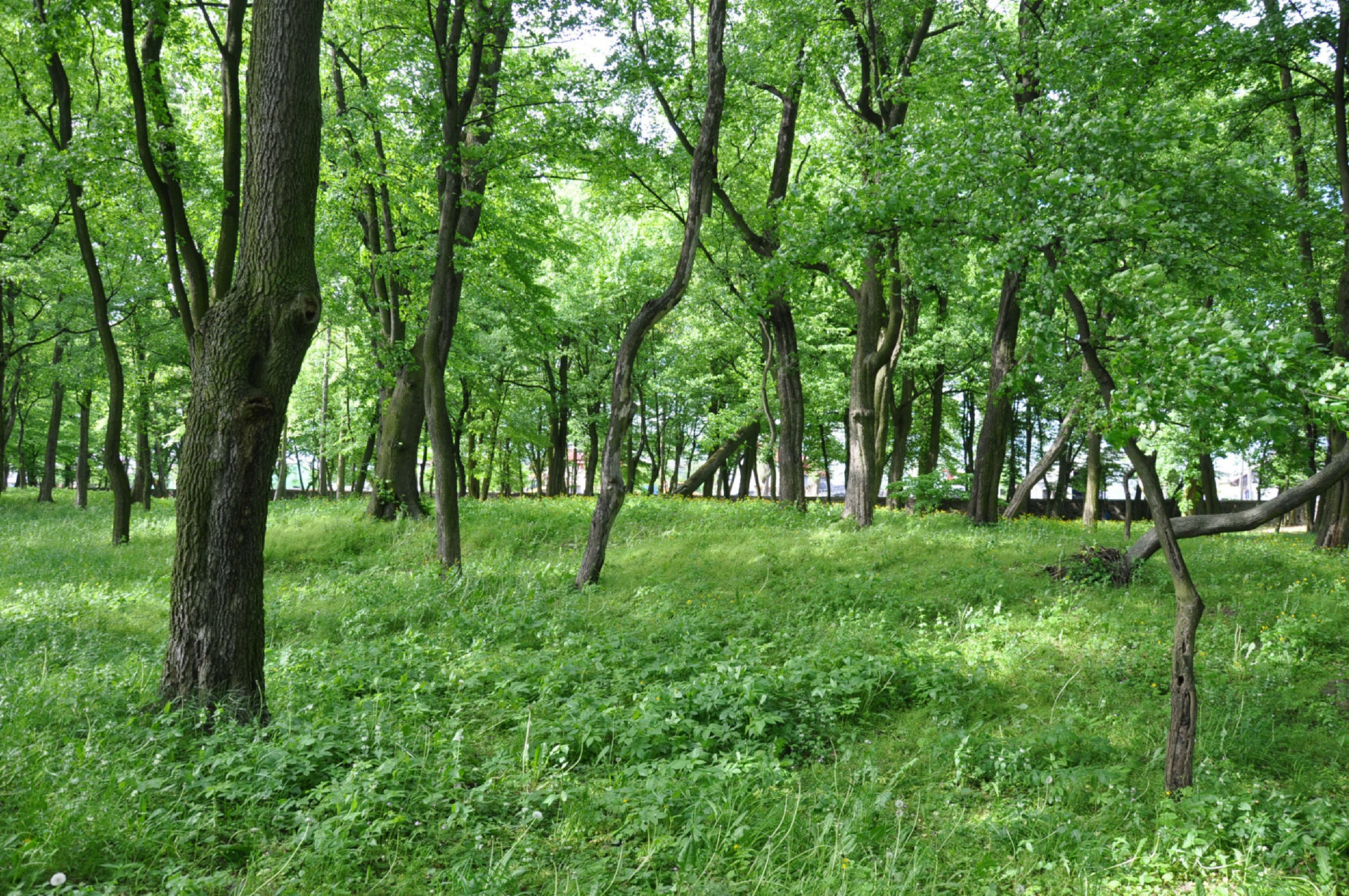 Na terenie parku znajduje się niewielki kopiec o średnicy ok 10m. Nasyp ulokowany jest ok 200m w kierunku wschodnim od budynku pałacu. W odległości 20m na południe od niego znajduje się staw. Na powierzchni nasypu zalega gruz kamienno-ceglany, zawierający także cegły gotyckie wydobyte podczas badań. Pod nasypem znajdują się relikty murowanej budowli wzniesionej w mieszanej konstrukcji ceglano-kamiennej o nieustalonym rozplanowaniu i przeznaczeniu (być może lamus bądź lodownia). Lica ceglane wykonane były z cegły rozbiórkowej (zidentyfikowano cegłę gotycką jak i współczesną, maszynową). Budynek uległ pożarowi, po którym został rozebrany do fundamentów i zasypany. Być może przy jego wznoszeniu wykorzystano część materiałów z rozebranego dawnego dworu Kiernowskich. Być może był o także "budynek na kopcu"