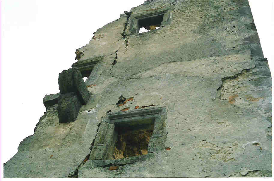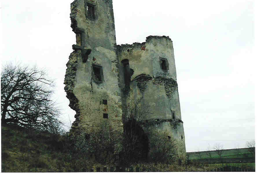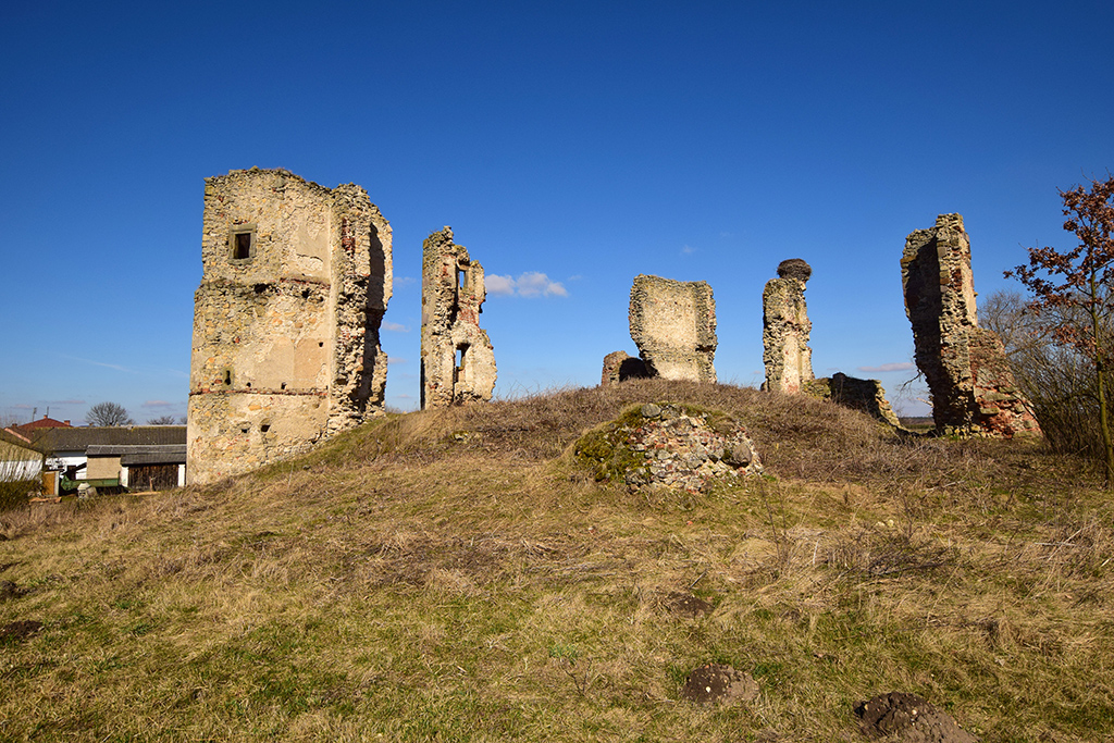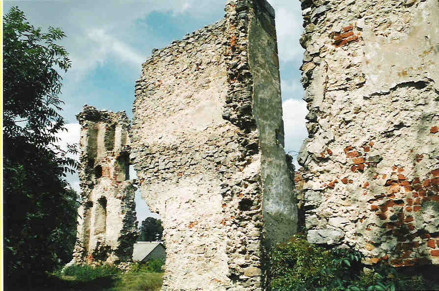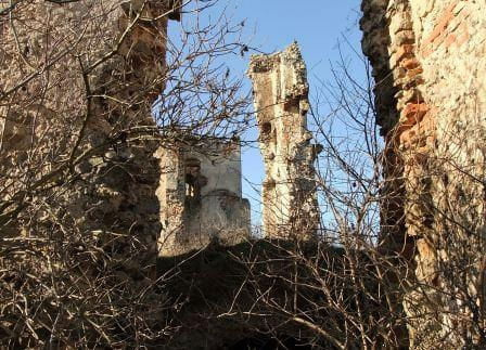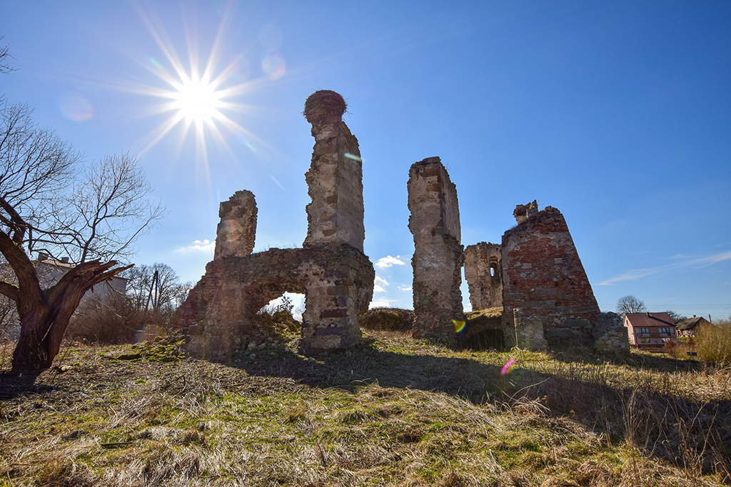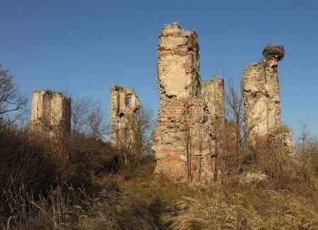 Źli ludzie rozebrali stary drewniany płotek otaczający zamek, widoczny na zdjęciach jeszcze sprzed 5-6 lat. Pewnie poszedł na opał. Na szczęście bocianie gniazdo nadal na swoim miejscu. Wstęp do ruin całkowicie wolny. Tabliczka "Teren Prywatny" zniknęła. fot. listopad 2011