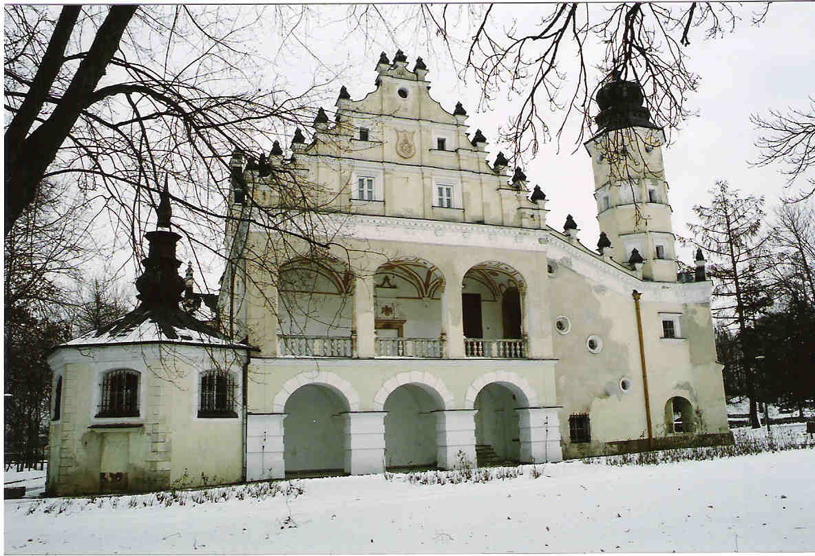 Dwór obronny wzniesiony przed 1617 z fundacji Zygmunta Grudzińskiego, wojewody rawskiego. Budowę kontynuowała jego żona Barbara z Karśnickich herbu Jastrzębiec (zm. po 1625), a następnie syn Stefan (zm. w 1640), starosta ujski, pilski i bolimowski. Jest to budynek piętrowy o dachu dwuspadowym, zamkniętym z dwóch stron dekoracyjnymi szczytami. Od wschodu do głównego budynku przylega wieża o wysokości 17 m. Od zachodu przed 1690 dobudowano ośmioboczną kaplicę z piękną dekoracją wnętrza. Najciekawszym elementem arch. są arkadowe krużganki filarowe, wbudowane w pd. elewację pałacu. Loggia, zbudowana około 1750 została ponownie odkryta w 1952 Na uwagę zasługuje sklepienie loggi - krzyżowe z pseudożebrami i dekoracją w postaci wytłaczanych pereł i jajowników z maszkaronami w zwornikach. Na ścianie południowej odkryto spod tynku bardzo interesujące fragmenty dekoracji sgraffitowej o motywach figuralnych. Pałac rozbudowano w XIX w.