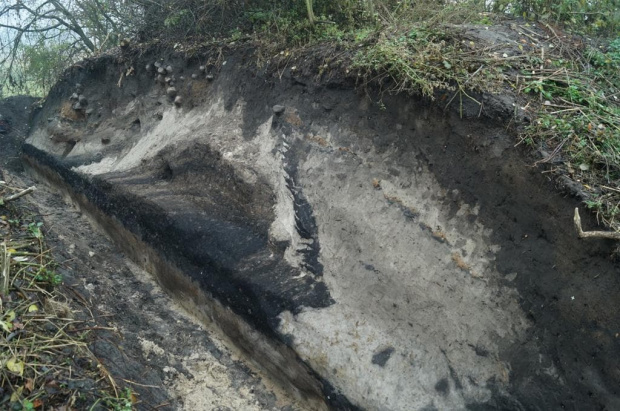 Ściana wykopu przecinającego nasyp grodziska, widoczne relikty najstarszego wału licowanego kostkami darni. Fot. J. Sikora