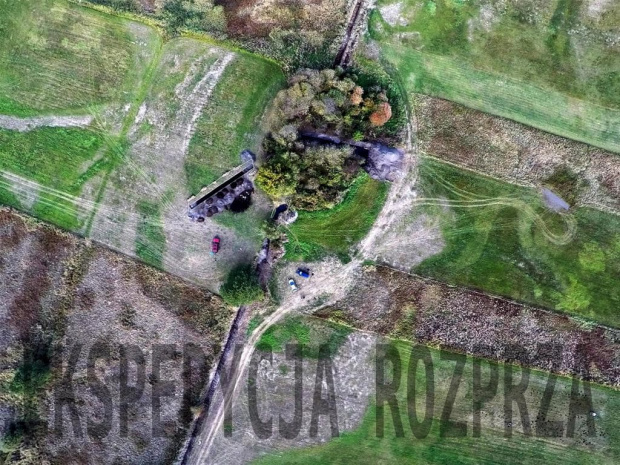 Zdjęcie lotnicze wykonane w październiku 2015 r. Widoczny układ fos, nasyp dookolnego wału oraz zasięg podgrodzia. Fot. Piotr Wroniecki
