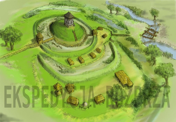 Rekonstrukcja grodu i jego otoczenia w XIV w. Rys. J. Sikora