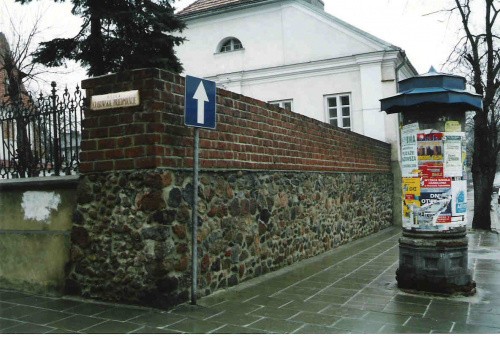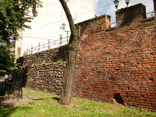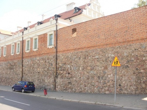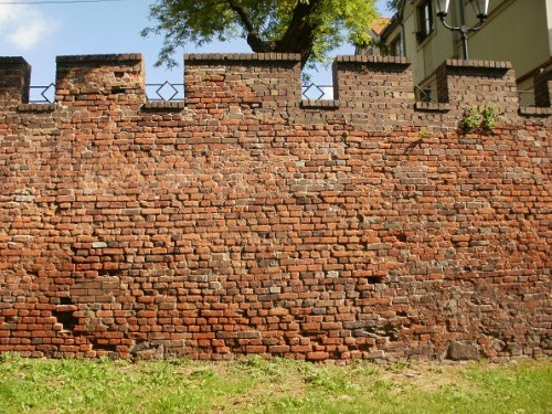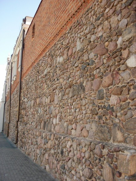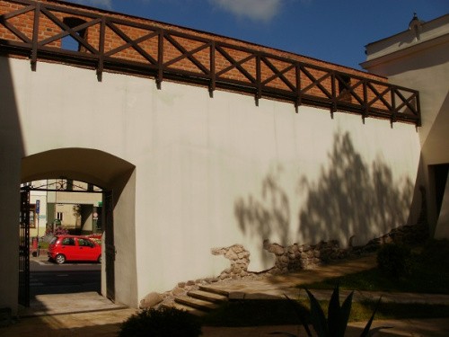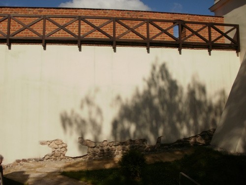 Mur przy Dominikankach od zewnątrz - widać warstwy wyrównawcze