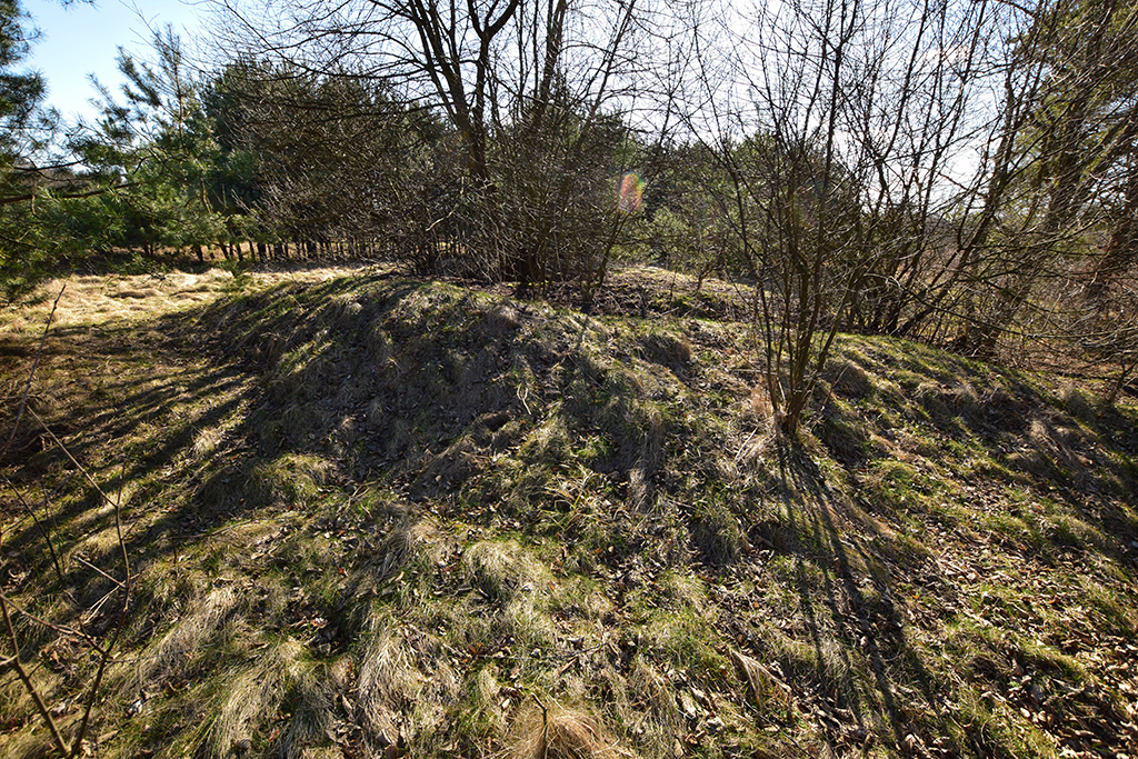 Ten gródek stożkowaty (kopiec) jest doskonale zachowany i jego zdjęcia za jakiś czas umieszczę. Ta pierwotna siedziba jest widoczna od ruin dworu tak samo jak z kopca widać ruiny. Miejsce po pierwotnej drewnianej siedzibie (czyli po kopcu) jest mniej więcej w połowie drogi między dworem a zamkiem do którego trzeba przejść przez las więc jest zupełnie niewidoczny.