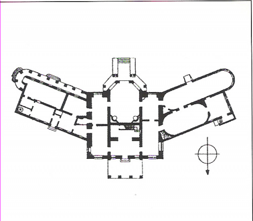 plan obecnego pałacu z zaznaczona bryła pierwotnej wieży mieszkalno-obronnej