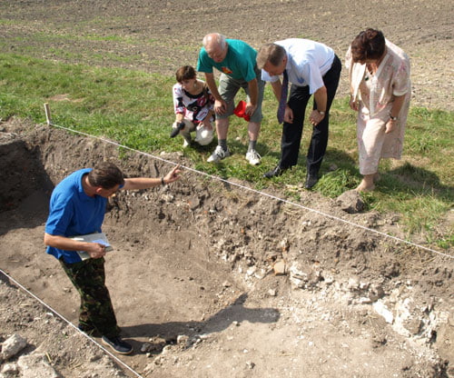 Prezydent Zamoyski i wiceprezydent Stopczyńska oraz dr Jacek Feduszka i dyr. Andrzej Urbański przy wykopie prawdopodobnie ukazującym zarys muru zewnętrznego dawnego dworu na Skokowce.