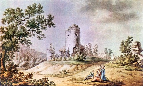 Rycina Vogla z 1793 roku z opisem: Ruiny zamku z okrągłą basztą i fragmentami murów (brak bliższych danych).