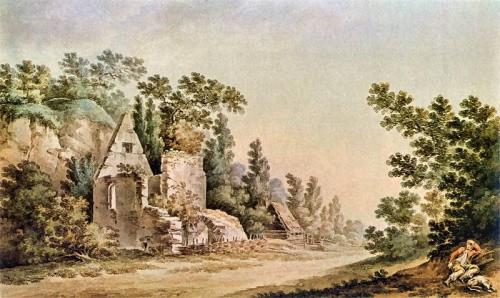 akwarela Vogla z 1793 roku z opisem: Ruiny budynku z trójkątnym szczytem (brak bliższych danych) - kaplica dworska?