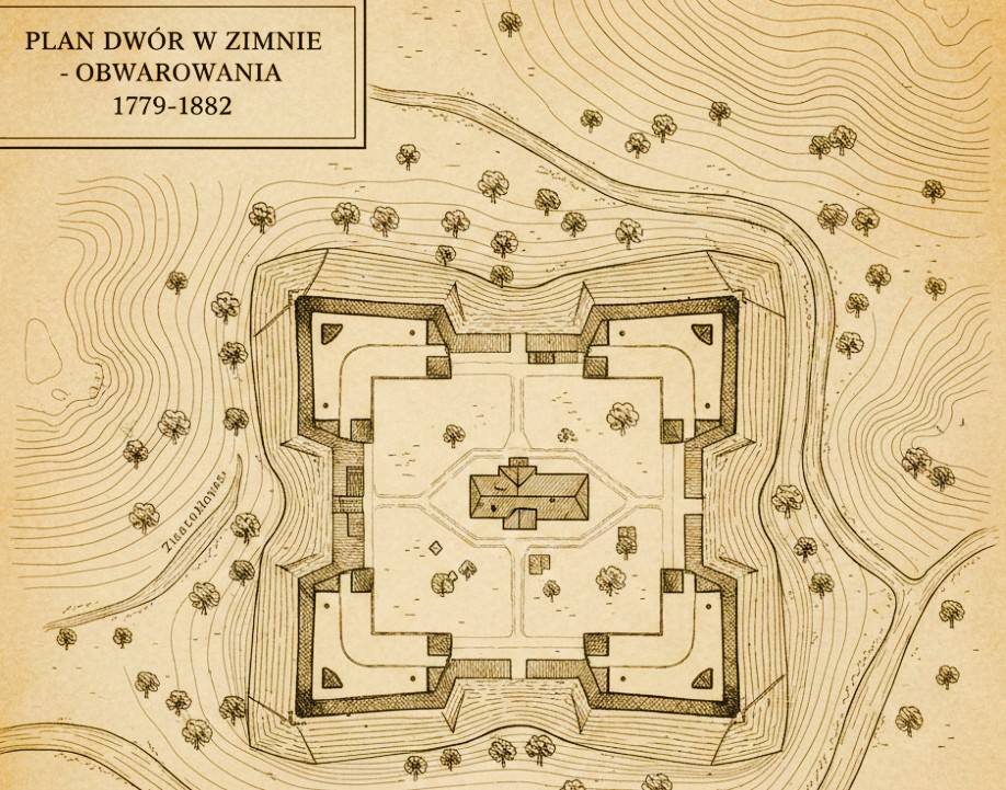 Elementy Architektoniczne na Mapie: Mury obronne: Tworzą zamknięty czworobok, co wskazuje na silne walory defensywne kompleksu.